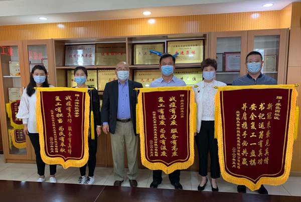 2020年5月12日,北京航天常興科技發展股份有限公司董事長楊迺文、總經理王德坤及董事會秘書趙琳向高米店街道工委、興濤社區居委會、康邑園社區登門拜訪并贈送三面錦旗。