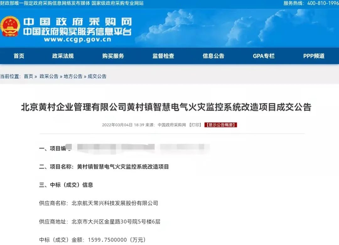 2022年3月4日,中國政府采購網公布了航天常興成功中標北京黃村鎮智慧電氣火災監控系統改造項目。作為該項目唯一一家中標企業,航天常興擁有無可比擬的競爭優勢。在北京市首批首臺(套)重大技術裝備授牌儀式中,航天常興攜大國重器脫穎而出。航天常興是電氣火災監控領域唯一一家首臺(套)入選企業,不僅技術過硬,而且得到了政府部門的高度認可,為我國經濟高質量發展樹信心、添動力。